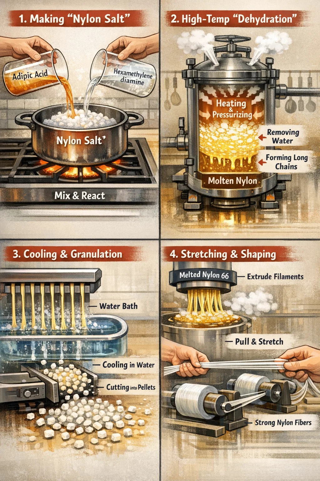 Díreach cosúil le sáile a ullmhú, meascann an mhonarcha dhá phríomh-amhábhar (aigéad adipic agus hexamethylenediamine) in uisce ar dtús. Imoibríonn an dá amhábhar seo chun substaint criostalach bán a fhoirmiú, ar a dtugtar "salann níolón."