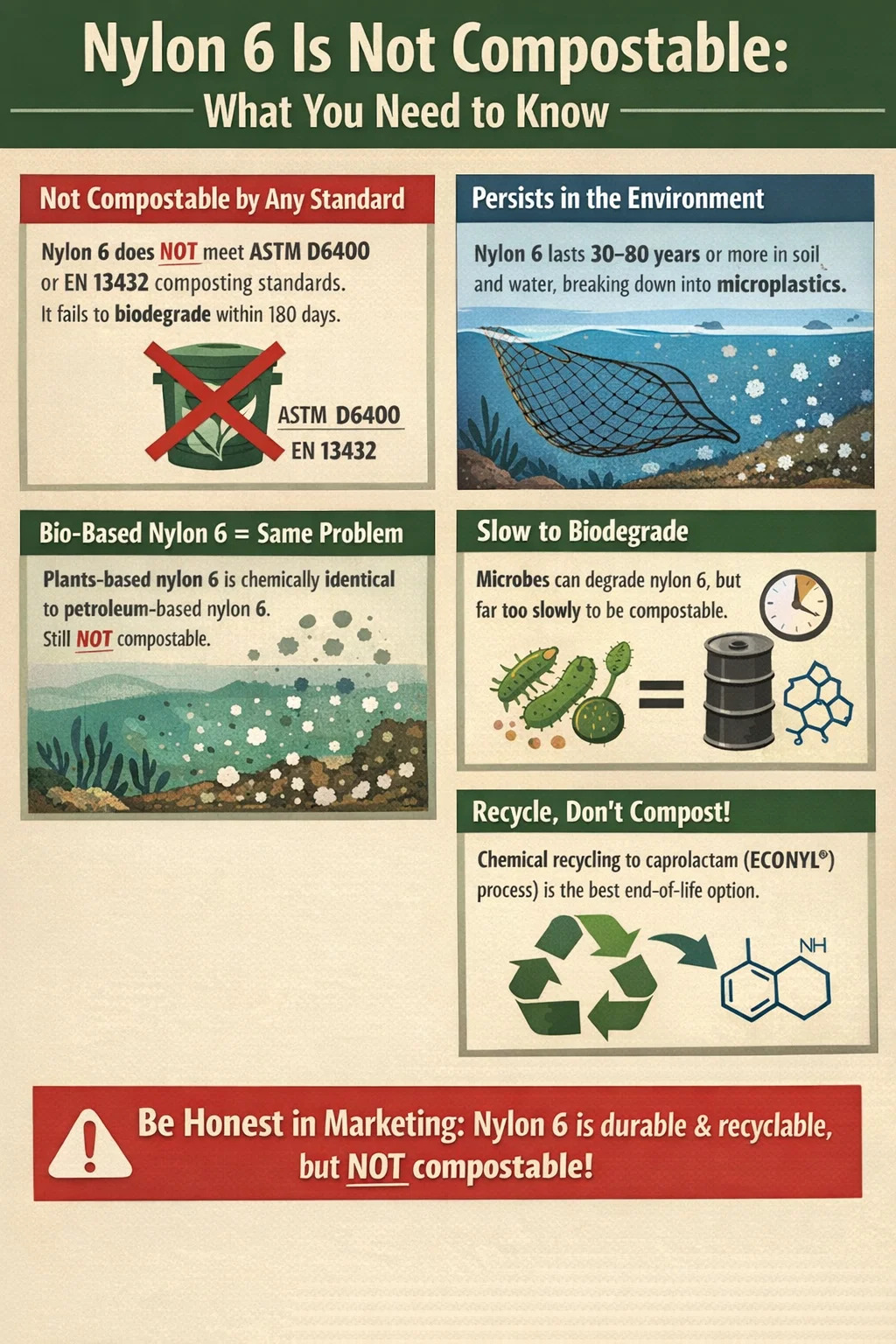 - Ná lipéadaigh táirgí ina bhfuil níolón 6 mar tháirgí inmhúirín, in-bhithdhíghrádaithe, nó "a fhilleann ar an dúlra" - tá sé seo míchruinn agus i go leor margaí is sárú rialála é faoin reachtaíocht um éileamh glas.