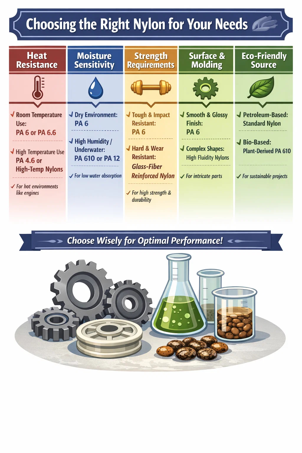 Foinse glas: Tá go leor níolóin ann freisin a bhaintear as plandaí (cosúil le ola castor), ar a dtugtar níolóin bithbhunaithe (cosúil le roinnt comhpháirteanna de PA 610). Má chuireann do thionscadal béim ar chosaint glas agus comhshaoil, beidh an cineál foinse polaimíde seo níos tarraingtí.