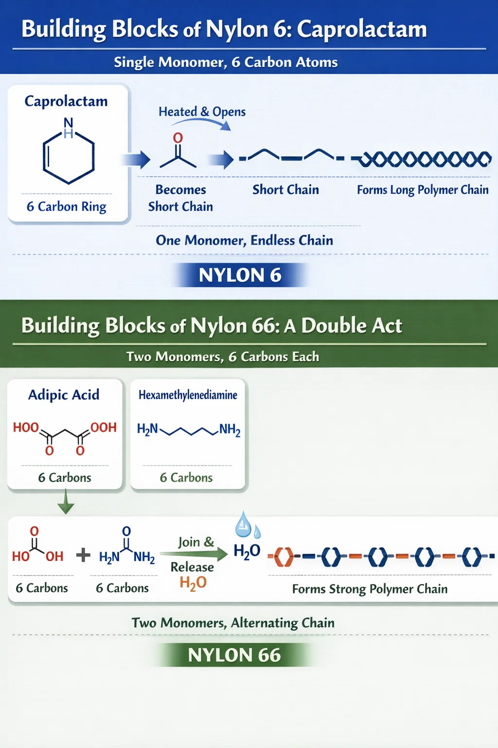 Tá níolón 66 cosúil le díséad; éilíonn sé dhá bhloc tógála éagsúla chun nascadh gach re seach.