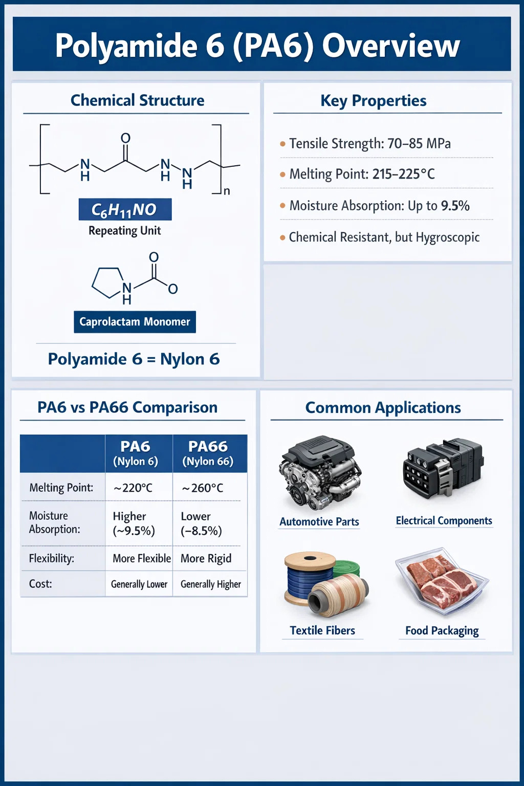 Ar fud an domhain, tá Polaimíd 6 ar cheann de na teirmeaplaisteacha innealtóireachta is fearr a úsáidtear. Sáraíonn méid táirgeachta bliantúil 4 milliún tonna méadrach , agus tá an t-ábhar lárnach do thionscail ó feithicleach agus leictreonaic go teicstílí agus pacáistiú bia. Níl ann ach an pointe tosaigh a thuiscint cad a sheasann PA6 dó — sainmhíníonn a cheimic, a saintréithe feidhmíochta, agus a iompar próiseála an fáth a bhfuil sé chomh ceannasach ó thaobh na tráchtála de.