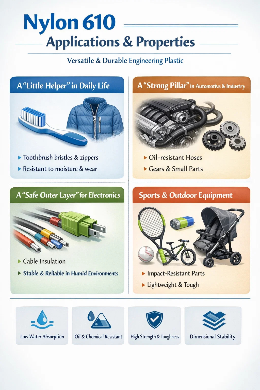 Is plaisteach innealtóireachta ardfheidhmíochta é níolón 610 (PA610) le sraith maoine an-chothromaithe. Titeann sé idir na hábhair níolón coitianta níolón 6 agus ard-deireadh, agus cuireann a saintréithe uathúla an-tóir air i go leor iarratas ar leith.